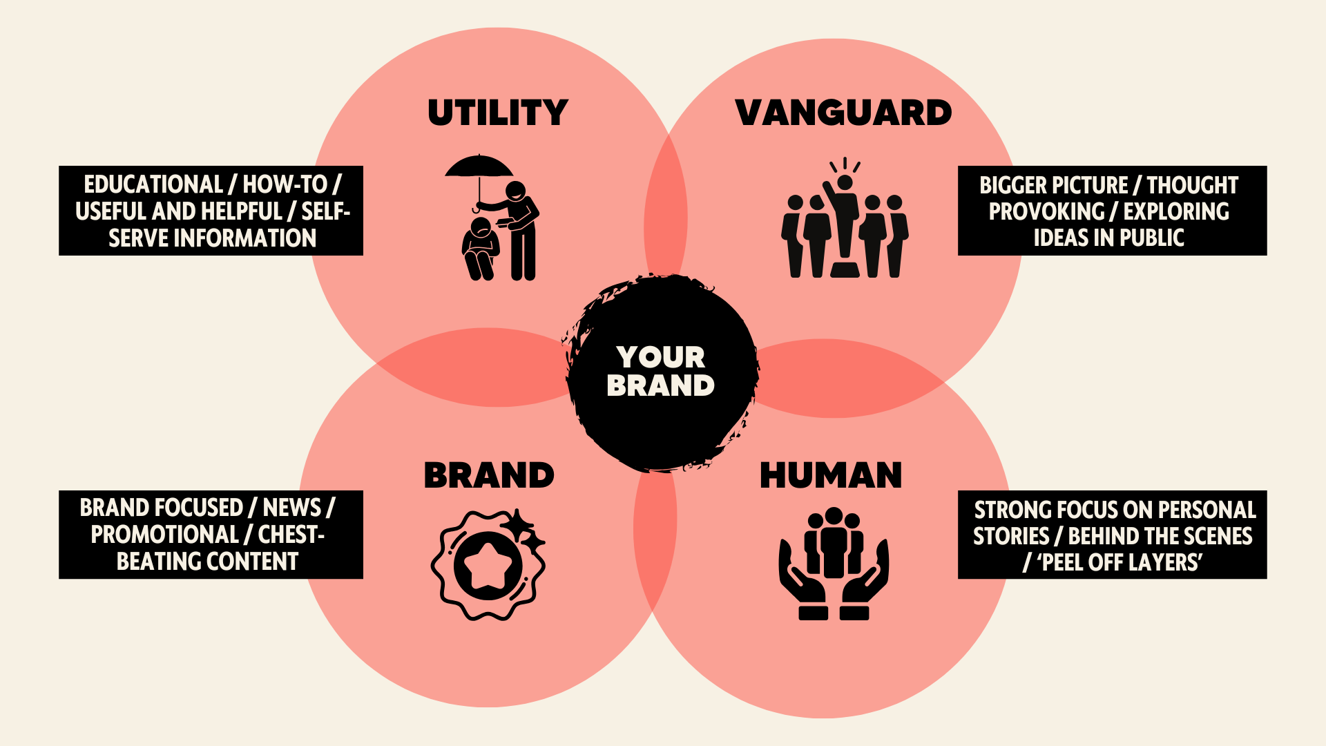 Personally, I think you should focus on producing either utility or vanguard content, but also infuse your efforts with a good smattering of human content, while limiting overtly promotional brand content.