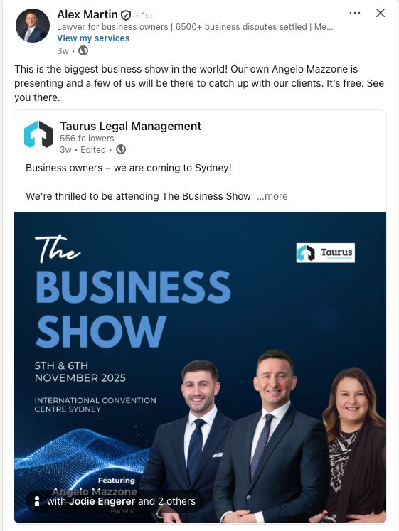- Promoting your owned, earned media efforts (or event appearances e.g. Taurus Legal Management👇