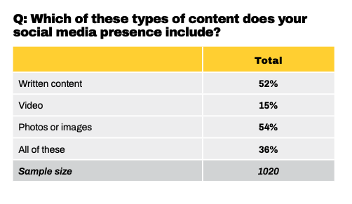 While we're on the subject of video, only 51 per cent of businesses are using the medium for social media purposes (see figures below - 15 per cent says they produce video content, while 36 per cent say they use all the mediums - video, photos/images and written content).