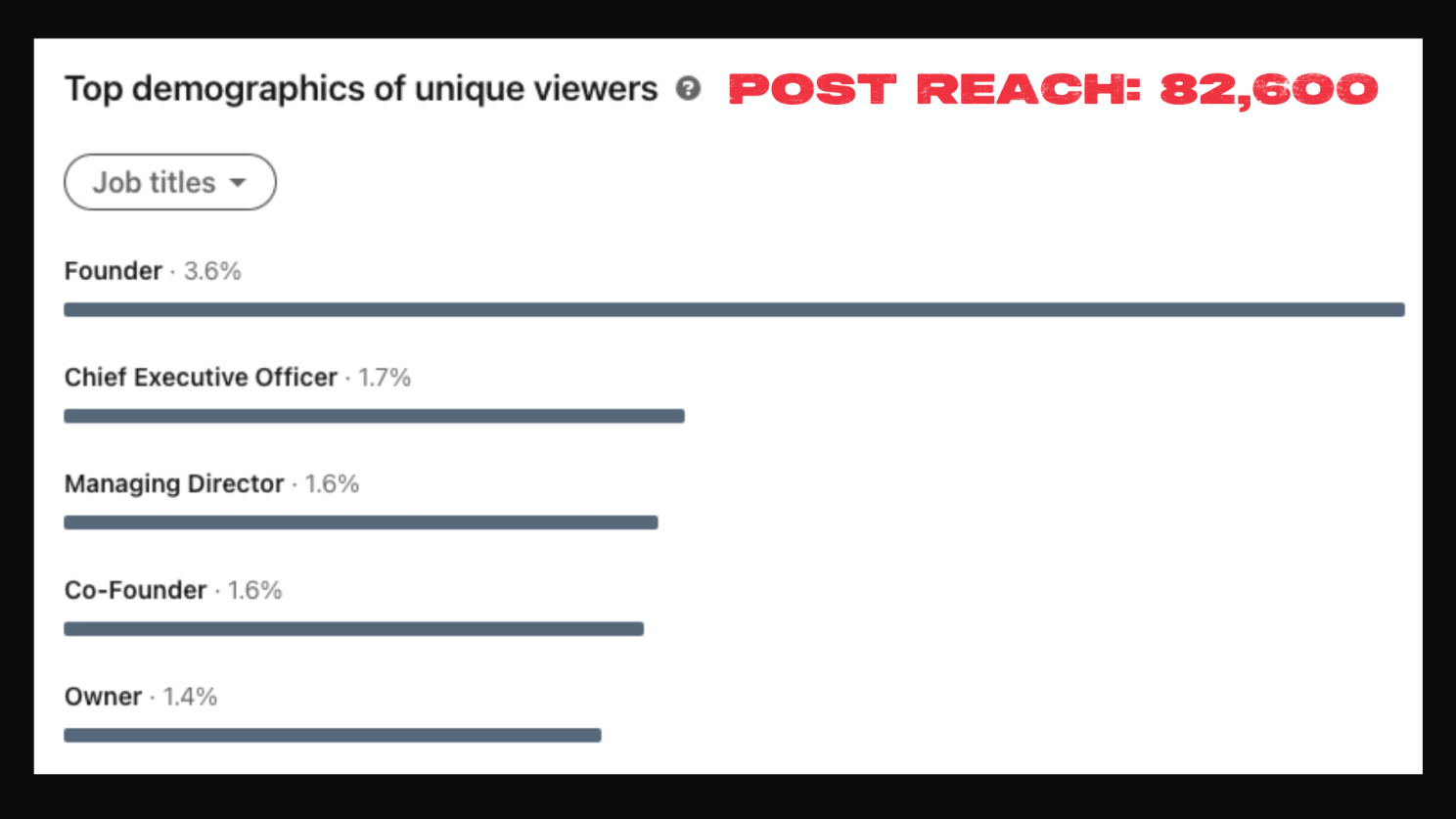 Let's look at the titles of those reached with the post - they were definitely in the right ballpark according to LinkedIn's analytics, albeit tracking well under example #1 (smaller reach) in percentage terms.