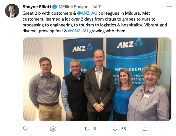 Another example: ANZ Bank CEO Shayne Elliott often posts photos of himself with employees or customers ...