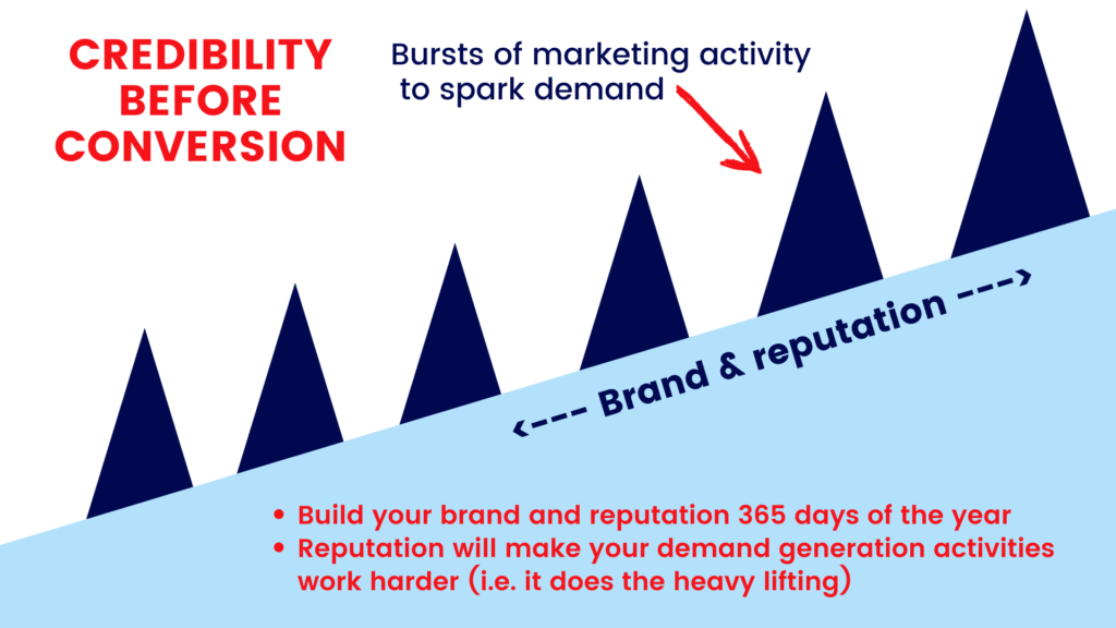 - Think two sides of the same coin: build your brand and reputation ongoing – and punctuate with bursts of promotional and lead gen activity (see graphic below).