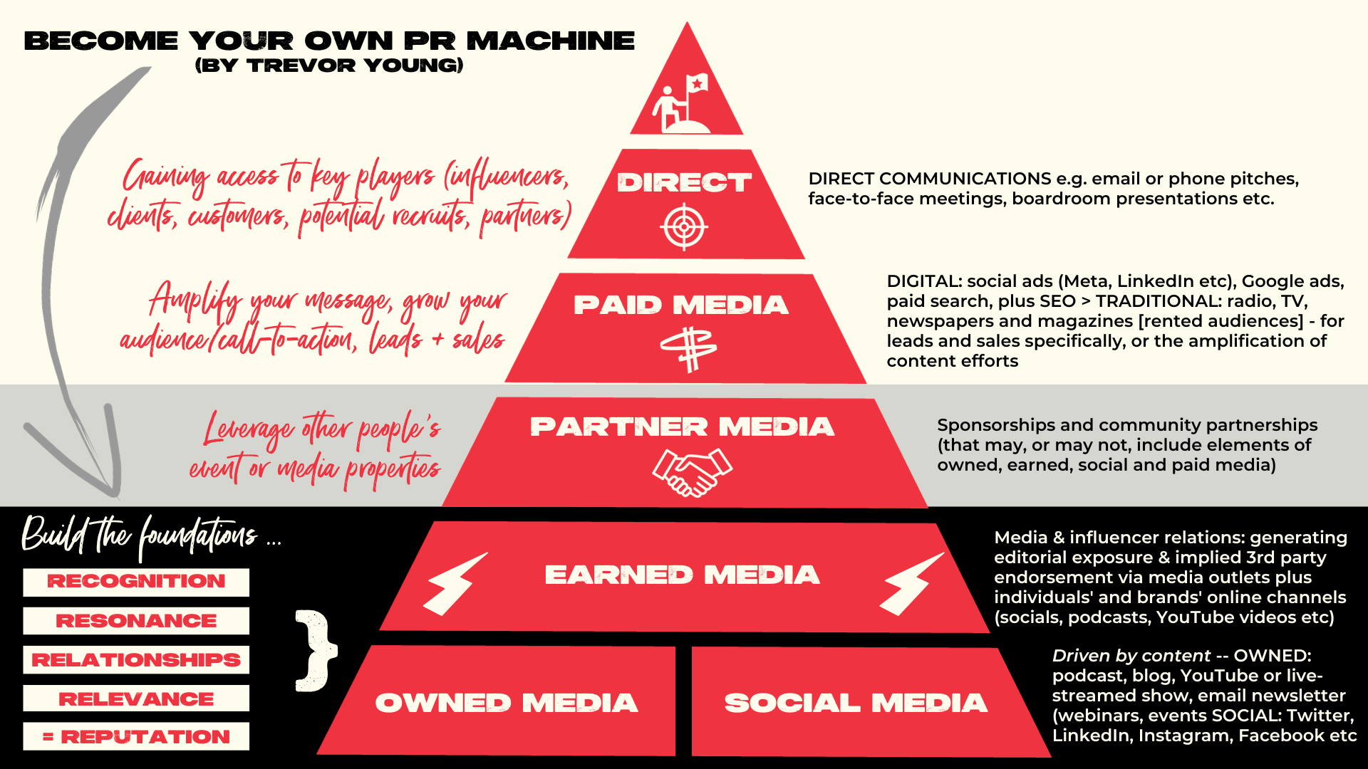 The foundations of the marketing communications pyramid comprise owned media, social media, and earned media in an integrated manner to build (a) recognition for your brand, (b) resonance for your story and your message, (c) relationships with key 'publics' ... plus grow and maintain (d) relevance and reputation in the marketplace.