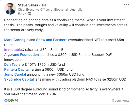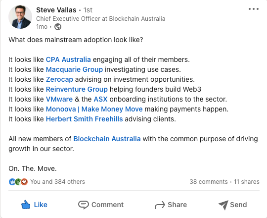 One tactic Steve uses better than most is tagging people (and organisations) in his posts, thus drawing more LinkedIn members into the conversation. He's shining the light on the efforts of others (like a good community-builder does) and is effectively taking people behind-the-scenes of the Blockchain movement as it gains momentum in Australia.