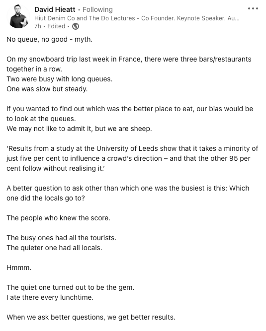 David’s LinkedIn posts come from the heart. He tells it as it is, and his take on modern business practices is refreshing.