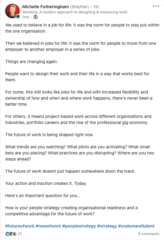 In keeping with this company mission, Michelle’s LinkedIn feed is jam-packed with posts that, in aggregate, chronicle the new way of working from multiple angles, from ‘big picture’ thoughts and insights to observations from the trenches of working life.