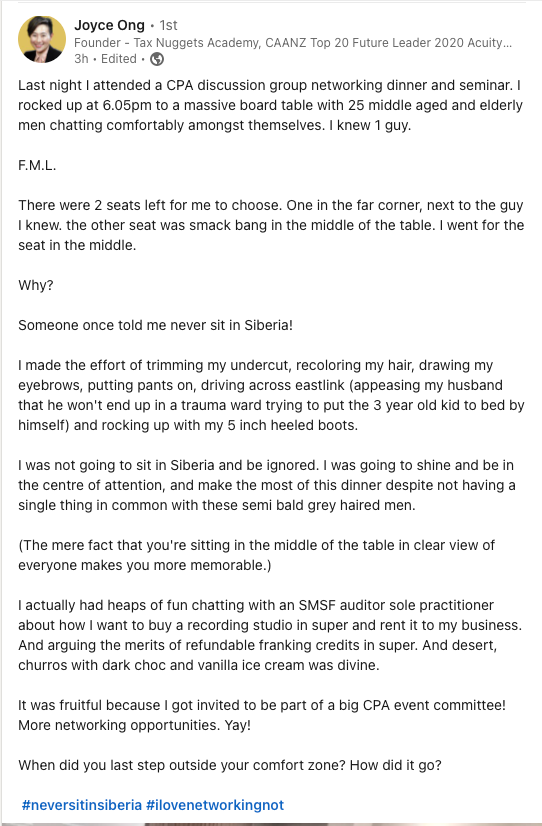Her posts pop out in my LinkedIn feed with remarkable regularity, and I always take the time to read them, even though I couldn’t give a stuff about tax 😜